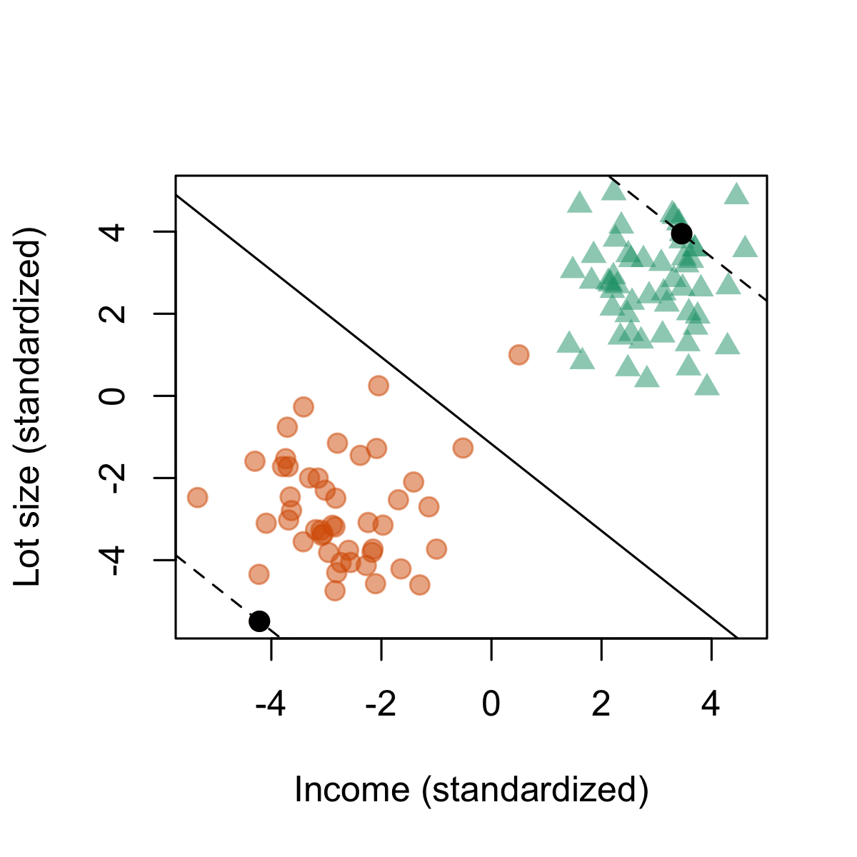 class: inverse, center background-image: url(images/svm-smiley.png) background-position: center background-size: cover # Support vector machines --- class: inverse, center, middle background-image: url(images/i_svm.jpg) background-position: center background-size: contain --- class: middle .pull-left[ .font125[ The usual introduction...😱 ] <img src="images/svm-pseudocode.jpg" width="100%" /> ] .pull-right[ <img src="08-SVM_files/figure-html/nope-nope-1.png" width="100%" /> ] --- class: center, middle ## A gentle introduction...  --- class: center, middle .font150[ Classification is all about finding a "good" [_decision boundary_](https://en.wikipedia.org/wiki/Decision_boundary) ] <img src="images/decision_boundaries.png" width="100%" style="display: block; margin: auto;" /> --- ## Support vector machines (SVMs) * .large[A direct approach to .red[binary] classification]: - Try to find a **hyperplane** in feature space that "best" separates the classes * .large[In practice, it is difficult (if not impossible) to find a hyperplane to separate the classes in the original feature space] -- .pull-left[ * .large[SVMs extend this idea in two ways:] - Relax/soften what we mean by separates - Use the [*kernel trick*](https://en.wikipedia.org/wiki/Kernel_method) to enlarge the feature space to the point that separation is (more) possible ] .pull-right[ <img src="Figures/08-Figures/08-smiley-1.svg" width="100%" style="display: block; margin: auto;" /> ] --- ## Hyperplanes .medium[ * A hyperplane in *p*-dimensional feature space is defined by the (linear) equation `$$f\left(X\right) = \beta_0 + \beta_1 X_1 + \dots + \beta_p X_p = 0$$` - For `\(p = 2\)` the hyperplane is just a .red[line] in 2-D space - For `\(p = 3\)` the hyperplane is a .red[plane] in 3-D space * `\(f\left(X\right) > 0\)` for points on one side of the hyperplane, and `\(f\left(X\right) < 0\)` for points on the other side * It is (mathematically) convenient to code the binary outcome using {-1, 1} so that `\(Y_i \times f\left(X_i\right) > 0\)` for points on the correct side of the decision boundary! ] --- class: inverse, center, middle background-image: url(images/separable.jpg) background-position: center background-size: contain # Seperable data --- ## Separating hyperplanes .larger[ * For two separable classes, there are an infinite number of separating hyperplanes! 😱 * What we want is a separating hyperplane with .red[good generalization performance]! * The .red[*hard margin classifier*] (HMC) is an "optimal" separating hyperplane and the simplest type of SVM ] --- class: center, middle ## The .red[*optimal separating hyperplane*] separates the two classes .red[and] maximizes the distance to the closest point from either class .right[.large[-Vladimir Vapnik]] --- <img src="Figures/08-Figures/08-separating-hyperplanes-01-1.svg" width="80%" style="display: block; margin: auto;" /> --- <img src="Figures/08-Figures/08-separating-hyperplanes-02-1.svg" width="80%" style="display: block; margin: auto;" /> --- class: inverse, center, middle background-image: url(images/explain.png) background-position: center background-size: contain --- <img src="Figures/08-Figures/08-plot-1.svg" width="80%" style="display: block; margin: auto;" /> --- <img src="Figures/08-Figures/08-chull-02-1.svg" width="80%" style="display: block; margin: auto;" /> --- <img src="Figures/08-Figures/08-chull-03-1.svg" width="80%" style="display: block; margin: auto;" /> --- <img src="Figures/08-Figures/08-chull-04-1.svg" width="80%" style="display: block; margin: auto;" /> --- <img src="Figures/08-Figures/08-chull-05-1.svg" width="80%" style="display: block; margin: auto;" /> --- <img src="Figures/08-Figures/08-chull-06-1.svg" width="80%" style="display: block; margin: auto;" /> --- <img src="Figures/08-Figures/08-chull-07-1.svg" width="80%" style="display: block; margin: auto;" /> --- ## The hard margin classifier 😱 <br/> .large[ `$$\underset{\beta_0, \beta_1, \dots, \beta_p}{\text{maximize}} \quad M$$` `$$\text{subject to:} \quad \begin{cases} \sum_{j = 1}^p \beta_j^2 = 1,\\ y_i\left(\beta_0 + \beta_1 x_{i1} + \dots + \beta_p x_{ip}\right) \ge M,\\ \quad \forall i = 1, 2, \dots, n \end{cases}$$` ] -- <br/> .red[.center[.large[This is a quadratic programming problem with linear inequality constraints!!]]] --- class: inverse, center, middle # Sometimes perfect separation is achievable, but not desirable! --- <img src="Figures/08-Figures/08-plot-again-1.svg" width="80%" style="display: block; margin: auto;" /> --- <img src="Figures/08-Figures/08-noisy-01-1.svg" width="80%" style="display: block; margin: auto;" /> --- <img src="Figures/08-Figures/08-noisy-02-1.svg" width="80%" style="display: block; margin: auto;" /> --- ## The soft margin classifier 😱 <br/> .font125[ `$$\underset{\beta_0, \beta_1, \dots, \beta_p}{\text{maximize}} \quad M$$` `$$\text{subject to:} \quad \begin{cases} \sum_{j = 1}^p \beta_j^2 = 1,\\ y_i\left(\beta_0 + \beta_1 x_{i1} + \dots + \beta_p x_{ip}\right) \ge M\left(1 - \xi_i\right),\\ \quad \forall i = 1, 2, \dots, n\\ \xi_i \ge 0, \\ \sum_{i = 1}^n \xi_i \le C\end{cases}$$` ] -- <br/> .red[.center[.large[This is a quadratic programming problem with linear inequality constraints!!]]] --- class: center, middle <img src="images/svm-classifiers.png" width="100%" style="display: block; margin: auto;" /> --- class: center, middle ## `\(C\)` is a regularization parameter <img src="Figures/08-Figures/08-noisy-path-01-1.svg" width="100%" style="display: block; margin: auto;" /> --- class: center, middle <!--  --> <img src="GIFs/svmpath.gif" alt="drawing" style="width: 600px;"/> --- class: center, middle ### As it turns out, you can fit the entire regularization path with essentially the same cost as a single SVM fit! <img src="Figures/08-Figures/hell-yeah-1.svg" width="40%" style="display: block; margin: auto;" /> --- class: inverse, center, middle background-image: url(images/non-separable.jpg) background-position: center background-size: co